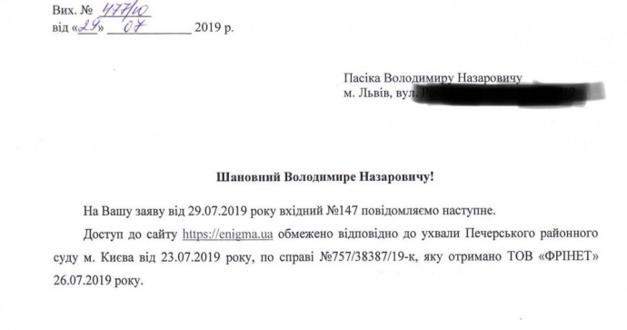 23 липня слідчий суддя Вовк С.В. розглядав справу №757/38387/19-к у кримінальному провадженні №12018060020001159 і наклав арешт на майнові права інтелектуальної власності, які виникають у користувачів інтернету при використані низки веб-ресурсів, зокрема й https://enigma.ua.