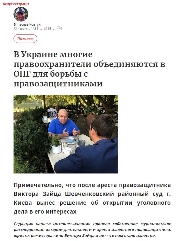 У ньому йшлося про арешт "правозахисника, юриста, режисера кіно Віктора Зайця", який також очолює ВГО "Всеукраїнська спілка народних реформ". Як стверджував автор, справу сфабрикували Олена Дегрик-Шевцова та її чоловік-поліцейський Євген Шевцов, адвокат Артем Шамрай і заступник начальника ДФС Києва Ігор Скороход.