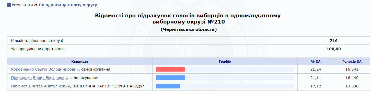 Центральна виборча комісія прийняла протокол про підсумки голосування в останньому мажоритарному окрузі на дострокових парламентських виборах - від окружної комісі №210 Чернігівської області.