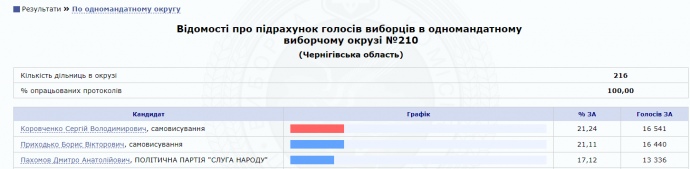 Згідно з даними на сайті ЦВК, переможцем визнано самовисуванця Сергія Коровченка – 21,24% голосів виборців. Його найближчий суперник - самовисуванець Борис Приходько відстав від нього на 101 голос.
