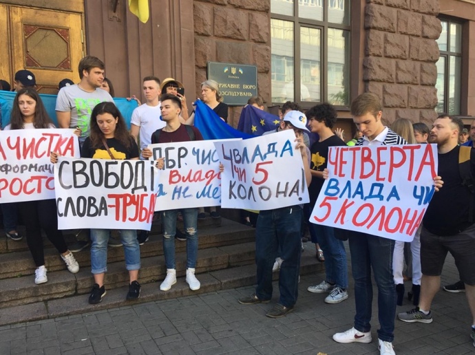 Дехто з них тримає символіку партії "Європейська солідарність", а також плакати "Четверта влада чи п'ята колона?", "ДБР, чистіть владу, а не медіа", "Свободі слова – Труба".