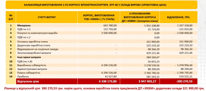 Деталі: Представники держконцерну порівняли вартість корпусів для БТР-4 у "ЛКМЗ" з вартістю корпусу з імпортної сталі в "Харківському конструкторському бюро з машинобудування ім. Морозова".