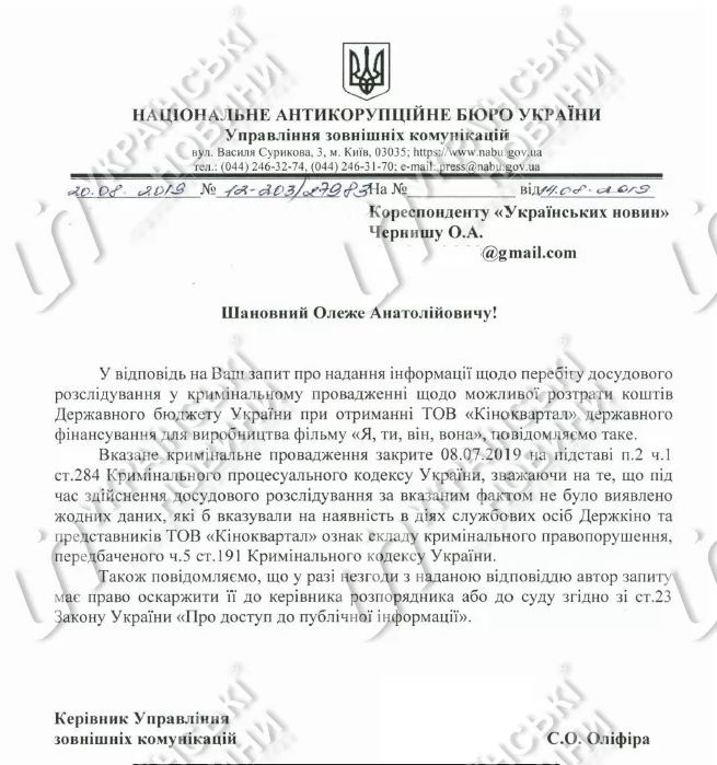 Під час провадження досудового розслідування за вказаним фактом не було виявлено жодних даних, які б вказували на наявність у діях службових осіб Держкіно і представників ТОВ "Кіноквартал" ознак складу кримінального правопорушення, передбаченого ч.5 ст. 191 (розтрата державних коштів в особливо великих розмірах) Кримінального кодексу".