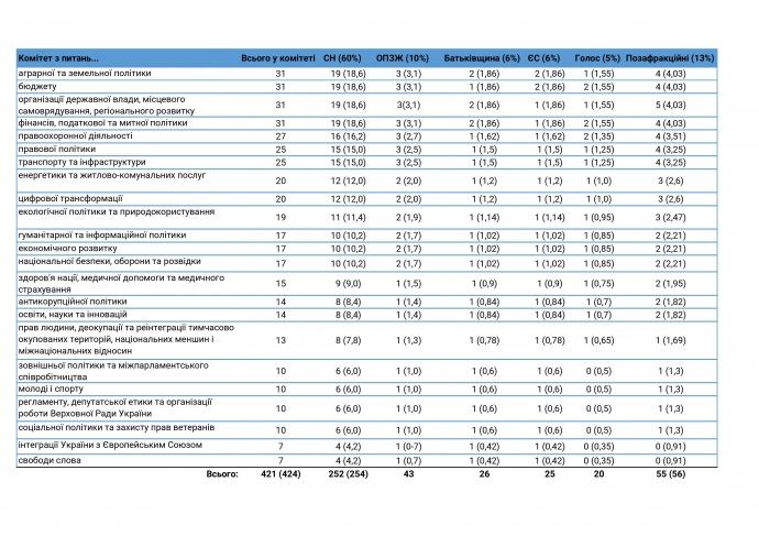 Таким чином "Слуга народу", де списочники і мажоритарники складають разом 254 депутати, або приблизно 60% від складу Ради, у кожному комітеті матиме 60% місць. Відповідно, ОПЗЖ отримає 10% місць, "Батьківщина" та "ЄС" – по 6%, "Голос" – 5%.