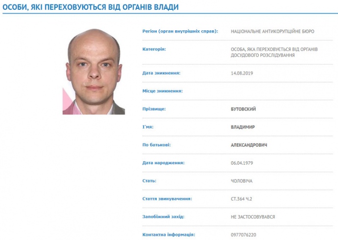 Згідно з сайтом МВС, Бутовського з 14 серпня оголосили у розшук, як особу, яка переховується від органів досудового розслідування.