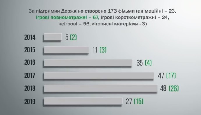 За 5 років за підтримки Держкіно було знято 173 фільми (67 ігрових повнометражних, 24 ігрових короткометражних, 23 анімаційних, 56 неігрових і 3 літописні матеріали).