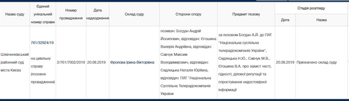 Відповідачами у справі вказані ПАТ "Національна суспільна телерадіокомпанія України" та журналісти Валерія Єгошина, Максим Савчук і Наталія Седлецька.