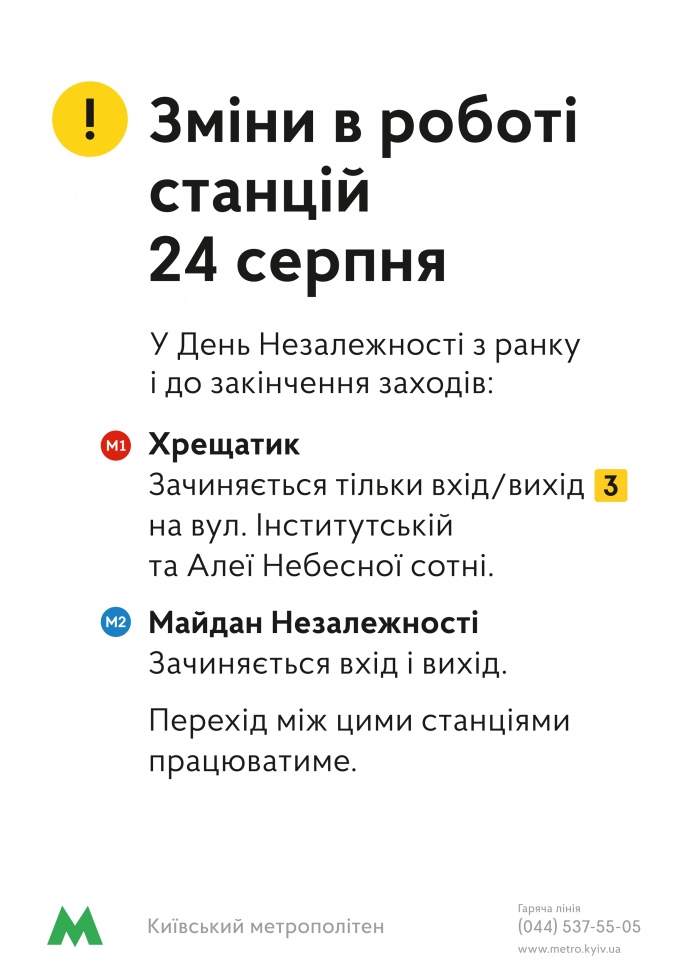 Докладно: "У День Незалежності зранку і до закінчення заходів станція "Хрещатик" зачиняється на вхід/вихід на вулиці Інститутській та Героїв Небесної Сотні. Станція "Майдан Незалежності" зачиняється і на вхід, і на вихід".