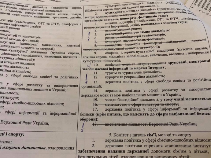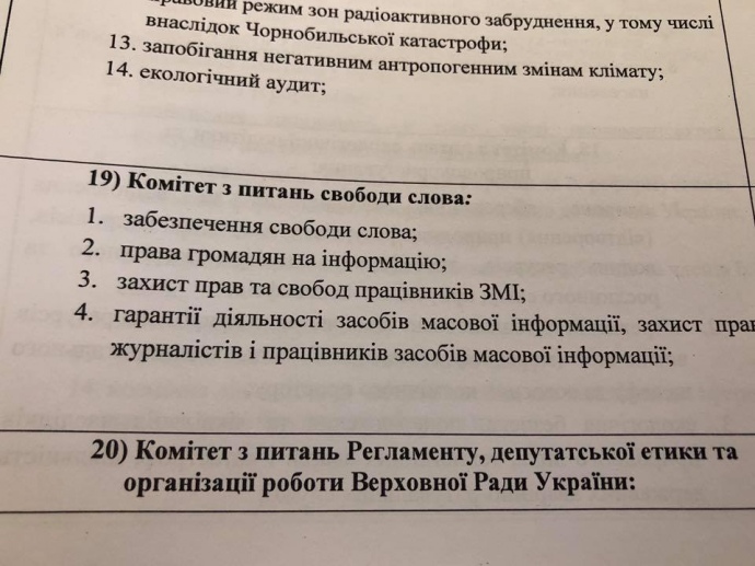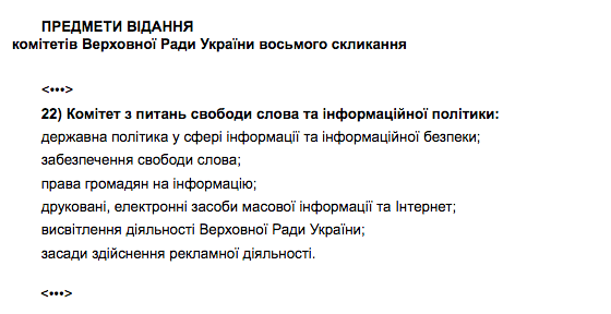 З посту Ірини Геращенко: "Вперше в історії ВР з відання цього комітету забрали навіть питання висвітлення діяльності ВР, а також питання рекламної діяльності і навіть питання друкованих, електронних ЗМІ та мережі інтернет".