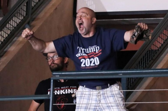На зустріч Трампа з виборцями прийшла група протестувальників. Коли вона залишала зібрання, чоловік на ім’я Френк Доусон у футболці із написом "Трамп 2020" махав їм кулаком услід. Але президенту, який у цей момент як раз виступав, здалося, що то один з учасників протесту.