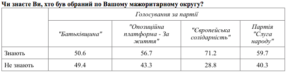 Деталі: Найбільше про свого мажоритарника знають виборці партії "Європейська солідарність" (71%), серед виборців партії "Батьківщина" – 51%, "Опозиційної платформи – За життя" – 57%, "Слуги народу" – 60%.