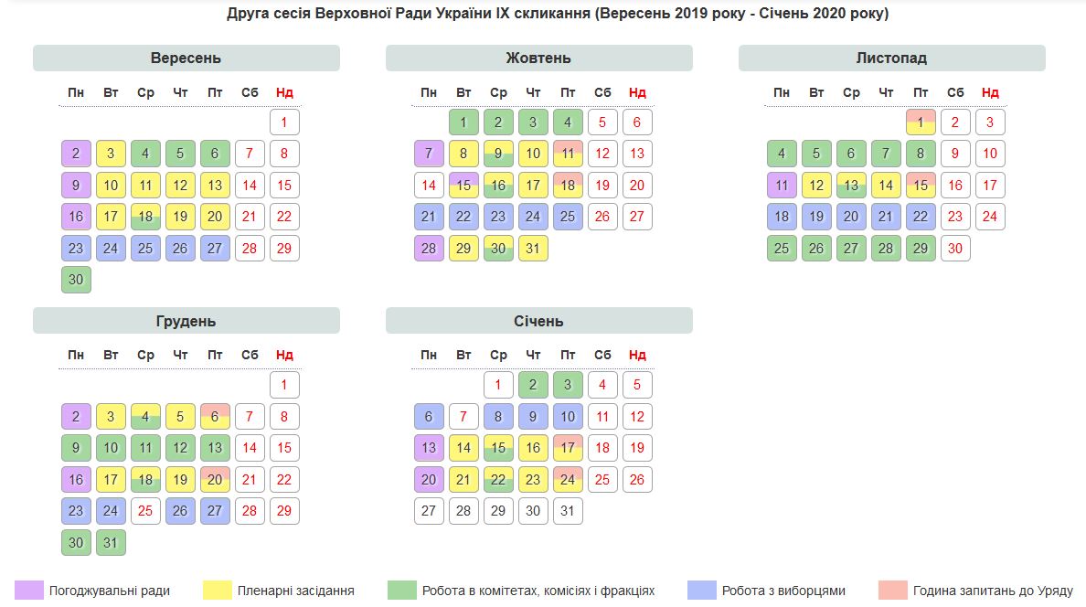 Верховна Рада оприлюднила календарний план своїх засідань на другу сесію – з вересня 2019 до січня 2020 року.