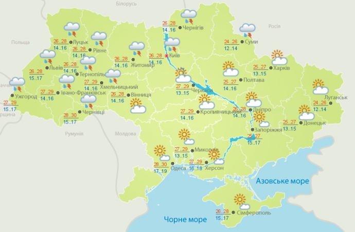У Києві 8-9 серпня невеликий короткочасний дощ, гроза. Температура вночі 13-18°; вдень 8 серпня 26-31°, 9 серпня 23-28°.
