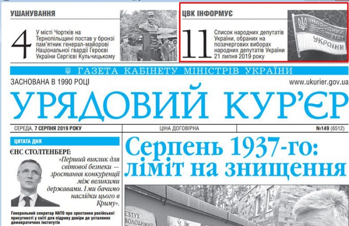 Деталі: В газетах "Голос України" та "Урядовий кур'єр" за 7 серпня наводиться список прізвищ нардепів, обраних по загальнодержавному округу та в одномандатних 198 округах. У переліку немає переможця по округу №210 на Чернігівщині. У ЦВК пояснюють, що результати по цій ОВК оскаржуються в суді. Прізвище переможця надрукують окремо.