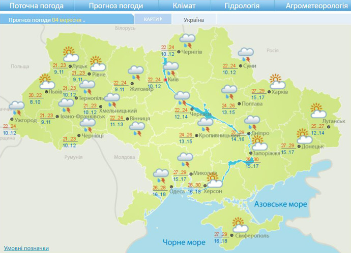 4 вересня погоду в більшості областей України визначатиме атмосферний фронт, який зумовить дощі на Правобережжі та похолодання.