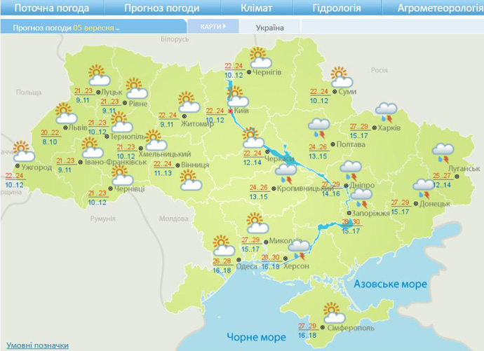 На 5 вересня синоптики прогнозують у південних, більшості центральних, східних і Сумській областях місцями короткочасний дощ, грози; на решті території - без опадів. Вітер змінних напрямків, 3-8 м/с, під час гроз місцями шквали 15-20 м/с.