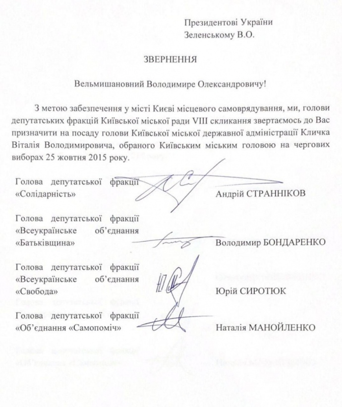 Голови депутатських фракцій Київської міської ради звернулися до президента Володимира Зеленського з проханням призначити Віталія Кличка на посаду голови КМДА.