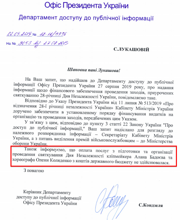 При цьому у відповіді Мінкульту не зазначено, чи розповсюджується кошторис 2019-го року на ходу за участі президента та участь відомих артистів, зокрема, кліпмейкера Алана Бадоєва, хореографа Олени Коляденко, співачок Тіни Кароль та Аліни Паш.