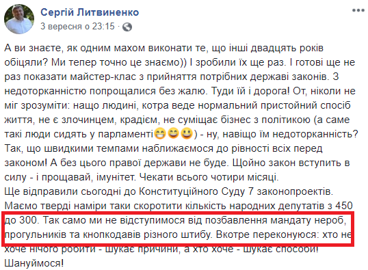 Примітно, що того ж дня, 3 вересня, вже після кнопкодавства Литвиненко опублікував пост у Facebook, де наголосив, що "Слуга народу" запровадить позбавлення нардепа мандата за кнопкодавство.
