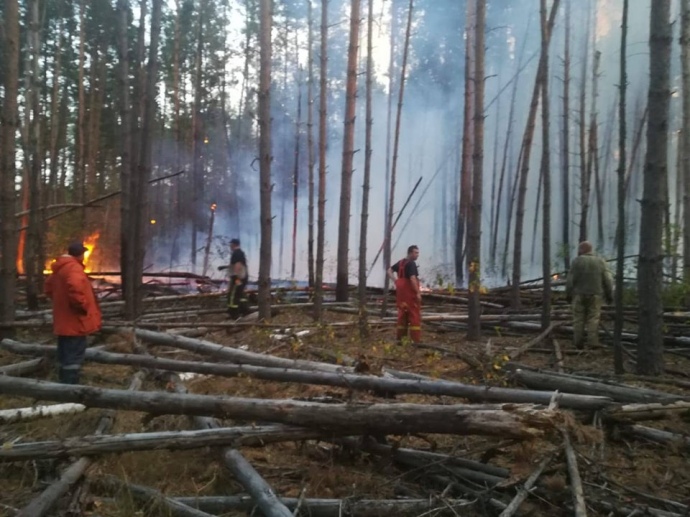 Деталі: За даними Державної служби з надзвичайних ситуацій, там зайнялася лісова підстилка. Горить окремими осередками, місцями з переходом у верхову пожежу. Наразі до гасіння пожежі залучено 101 людину особового складу та 12 одиниць техніки. Також працює авіація: 2 літаки АН-32П та вертоліт МІ-8.