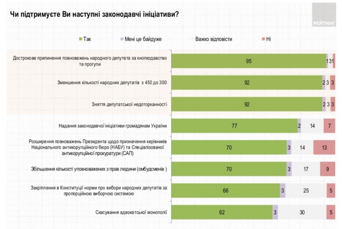 Дослівно: "Абсолютна більшість опитаних (понад 90%) підтримують ініціативи стосовно дострокового припинення повноважень народного депутата за кнопкодавство та прогули, зменшення кiлькостi народних депутатiв з 450 до 300 та зняття депутатської недоторканності".