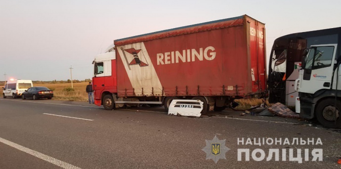 Деталі: Рухаючись у напрямку Харкова по швидкісній трасі, вантажівка зіткнулася із припаркованим на узбіччі пасажирським автобусом. Від удару той наїхав на трьох чоловіків, які стояли попереду нього.