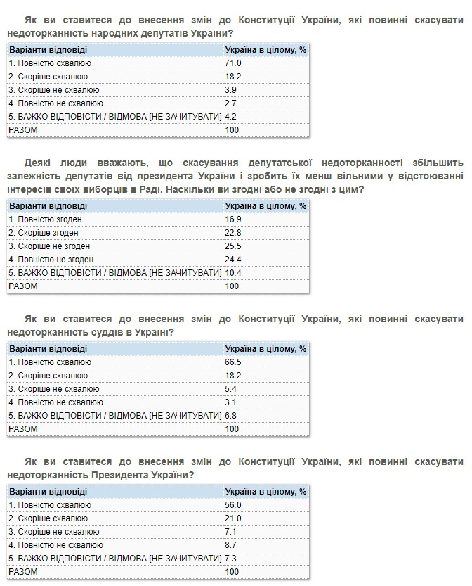 Лише 7-8% опитаних не схвалюють внесення змін до Конституції, що дозволять скасувати недоторканність народних депутатів, суддів та президента.