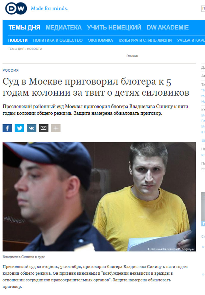 Також "ознаки виправдання екстремізму" нібито були виявлені і в публікаціях Deutsche Welle про блогера Владислава Синицю, якого звинуватили у погрозах дітям російських силовиків у Twitter і засудили до 5 років колонії.