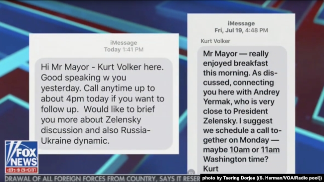 Згідно з іншим текстовим повідомленням, Волкер запропонував Джуліані проконсультувати його про Зеленського та динаміку російсько-українських відносин. Джуліані наполягає, що він діяв від імені Держдепартаменту США.
