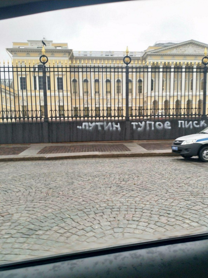 29 вересня в російському Петербурзі підняли по тривозі поліцію для пошуків вандала, який написав образливе повідомлення про президента РФ Володимира Путіна на паркані Російського музею.