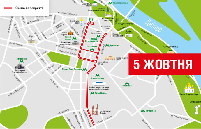 Від ранку 5 жовтня до 22:00 6 жовтня закриють для проїзду вулиці Трьохсвятительську та Володимирську (ділянка від Великої Житомирської до Софіївської).