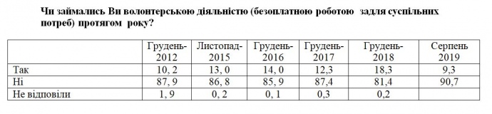 Деталі: Згідно з дослідженням, волонтерською діяльністю протягом 2019 року займалися 9% громадян, у той час як минулого року їхня частка складала 18%.