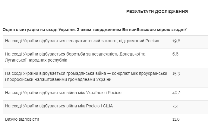 Деталі: Соціологи зазначають, що 40% респондентів вважають, що на сході України відбувається війна між Україною і Росією, ще 20% – що там відбувається сепаратистський заколот, підтриманий Росією, 15% поділяють думку, що на сході України відбувається громадянська війна – конфлікт між проукраїнськи і проросійськи налаштованими громадянами України.