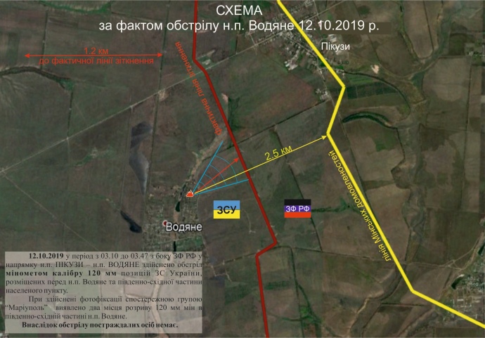 "Зафіксовано та підтверджено факт здійснення обстрілу із застосуванням 120-мм мінометів. Додатково групою проведено опитування представників підрозділів ЗСУ розташованих поблизу та, за їх допомоги, виявлено два місця розриву 120-мм мін в південно-східній частині н.п. Водяне", - йдеться у повідомленні штабу.