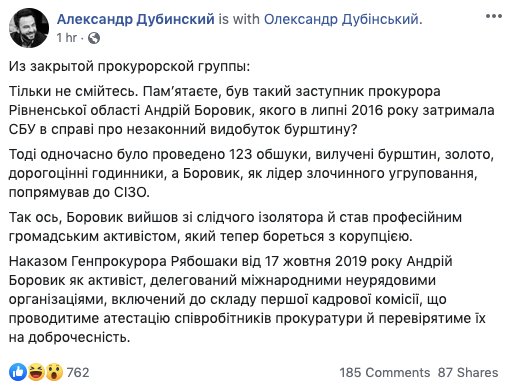 Дослівно у пості Дубінського: "Тільки не смійтесь. Пам’ятаєте, був такий заступник прокурора Рівненської області Андрій Боровик, якого в липні 2016 року затримала СБУ в справі про незаконний видобуток бурштину?