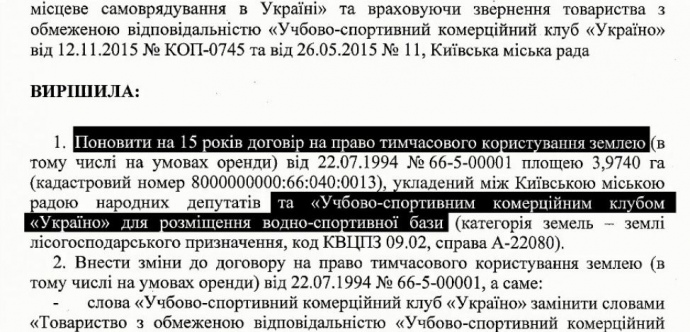 Цю ділянку місто передало в оренду на 15 років під водно-спортивний комплекс ТОВ "Учбово-спортивний комерційний клуб "Україно".