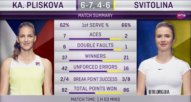 На рахунку Плішкової 7 ейсів при 6 подвійних помилках, 37 віннер і 42 невимушених помилки, 2 реалізованих шанси на брейк із 4.