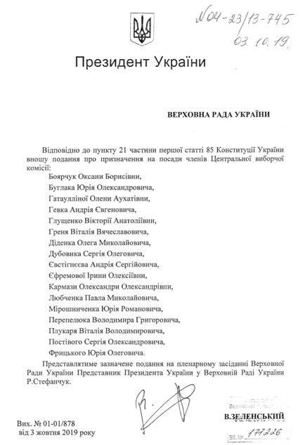 Дослівно: "Відповідно до пункту 21 частини першої статті 85 Конституції України вношу подання про призначення на посади членів Центральної виборчої комісії: