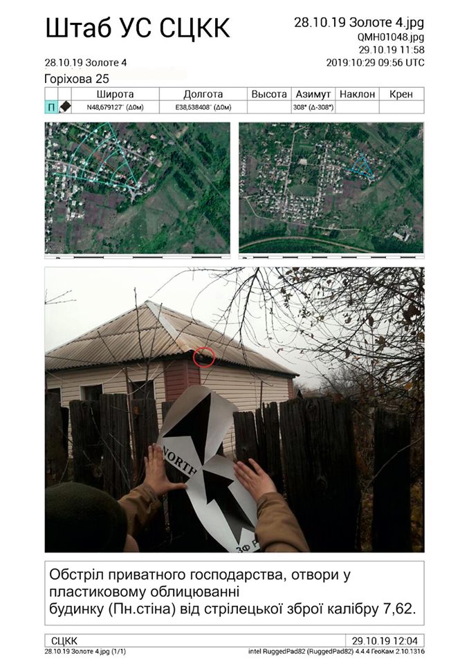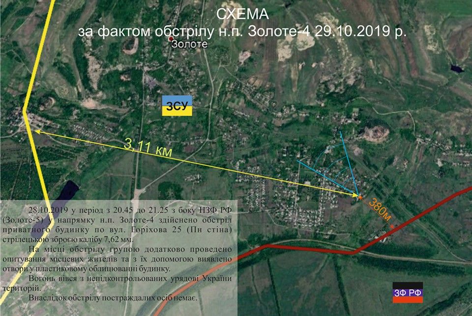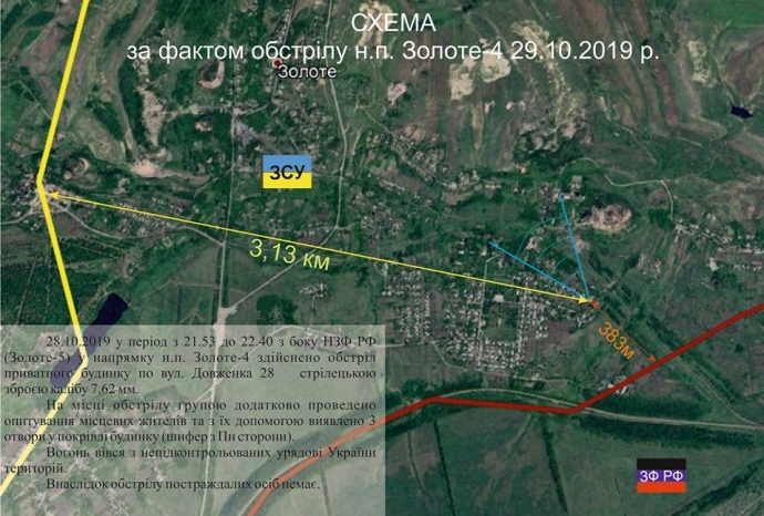 Дослівно: "28.10.2019, у період з 20:45 до 21:25 та з 21:53 до 22:40 з боку ЗС РФ у напрямку н.п. Золоте-4 здійснено обстріли із застосуванням стрілецької зброї".