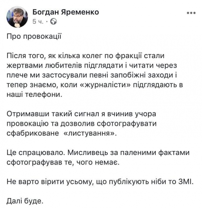 "Після того, як кілька колег по фракції стали жертвами любителів підглядати і читати через плече ми застосували певні запобіжні заходи і тепер знаємо, коли "журналісти" підглядають в наші телефони. Отримавши такий сигнал я вчинив учора провокацію та дозволив сфотографувати сфабриковане "листування", - написав тоді Яременко.
