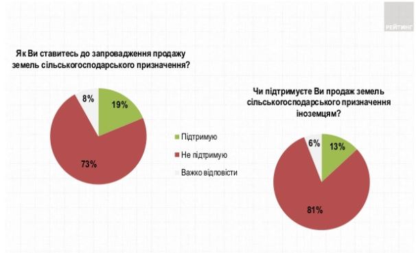 Деталі: Згідно з результатами опитування, лише 19% опитаних підтримують запровадження продажу землі сільськогосподарського призначення. 73% – проти цієї ініціативи, 8% – не визначилися.
