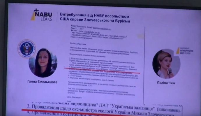 Деркач пояснив, що співробітниця посольства робить запит до НАБУ щодо діяльності екс-міністра екології Миколи Злочевського, який фігурує у розслідуванні щодо компанії "Burisma". На думку українських правоохоронців, Злочевський зв'язувався через лобістів з Байденом старшим та пропонував розділити прибуток газодобувної компанії.