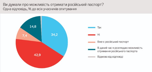 Деталі: Разом з тим 41,6% мешканців ОРДЛО мають паспорти ДНР/ЛНР (34,8%) чи Росії (6,8%). 42,9% опитаних ніколи не думали про отримання російського паспорта.