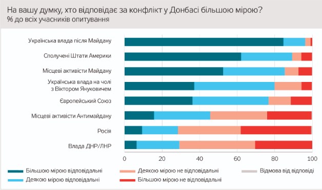 При цьому 86% із тим, що біля витоків конфлікту стояли проросійські угруповання й Москва "швидше не згодні" 45,1% і "абсолютно не згодні" 44,9% опитаних.