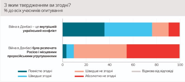 Деталі: 76% опитаний мешканців ОРДЛО "повністю згодні" і "швидше згодні" з тим, що війна в Донбасі - внутрішній український конфлікт (35,6 і 40,5% відповідно).