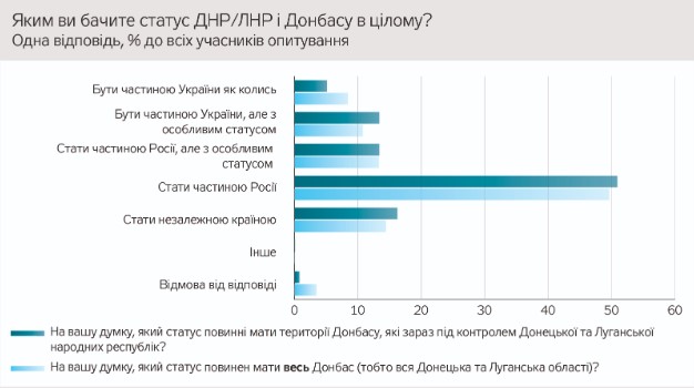 50,9% мешканців окупованих територій Луганської та Донецької областей вважають, що нинішні території ОРДЛО мають стати частиною Росії, 13,4% - "частиною Росії, але з особливим статусом".