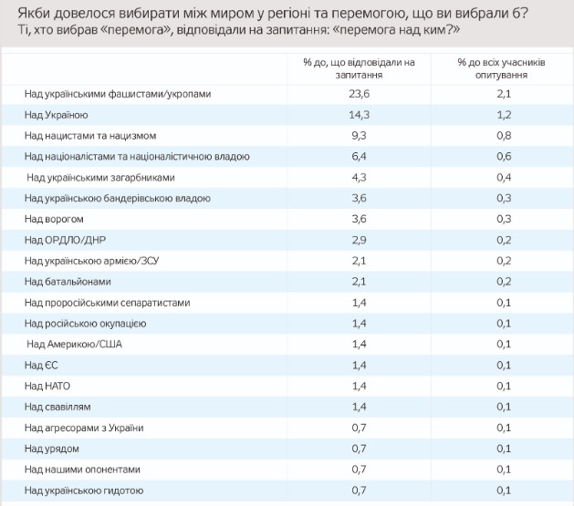 На питання, якби довелося обирати між миром в регіоні і перемогою, 8,7% заявили "перемога", 90,9% - "мир". При цьому ті, хто вибрав "перемога", відповідали на запитання "перемога над ким?", 23,6% з них відповіли "над українськими фашистами/укропами", над Україною - 14,3%, над нацистами та нацизмом - 9,3%.