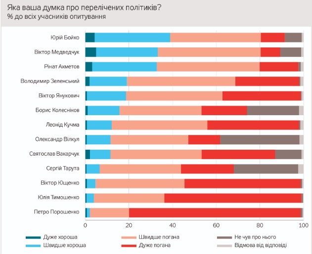 До Юлії Тимошенко "швидше, добре" ставляться 3,4% мешканців ОРДЛО, не довіряють 32,3%, 62,8% хочуть "обгородити її колючим дротом", до Віктора Ющенка - "швидше, погано" або "дуже погано" ставляться 40,8 і 53,2%, відповідно, "дуже доброї думки" про нього 0,7%, "швидше, доброї" 4%.