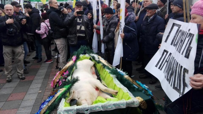 Під Верховну Раду, яка 13 листопада розглядатиме законопроєкт про скасування заборони на продаж земель сільськогосподарського призначення, принесли труп свині у труні і похоронні вінки.