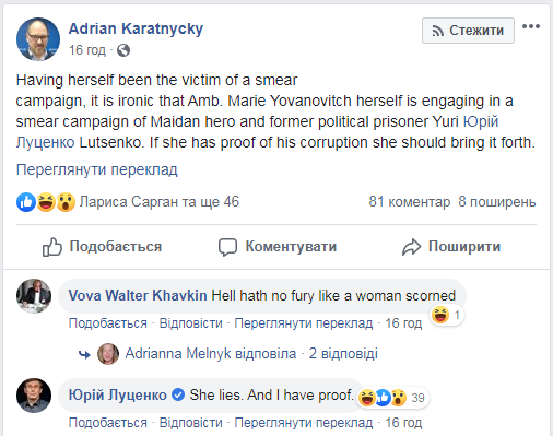 "Вона бреше. І я маю докази", - такий коментар Луценко зробив у соцмережі Facebook.